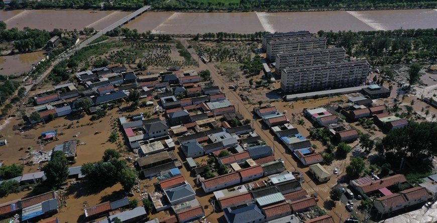 Nước lũ gây ngập lụt khắp khu vực rộng lớn ở quận Mật Vân, ngoại ô phía Đông Bắc Bắc Kinh (Trung Quốc), ngày 29-7. Ảnh: Tân Hoa xã |