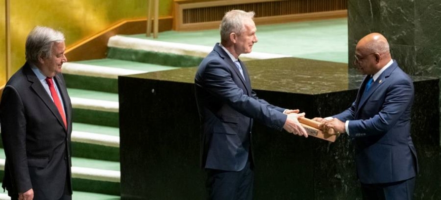 | Chủ tịch Đại hội đồng Liên hợp quốc khóa 76 Abdulla Shahid (bên phải) trao búa cho người kế nhiệm Csaba Korosi (giữa) trước sự chứng kiến của Tổng thư ký LHQ Antonio Guterres. Ảnh: un.org |