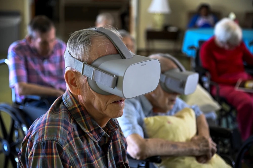 | Người cao tuổi ở viện dưỡng lão tại Falls Church (bang Virginia, Mỹ) trải nghiệm công nghệ thực tế ảo. Ảnh: Getty Images |