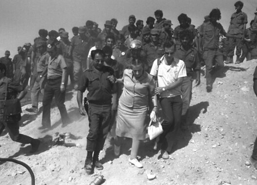 | Thủ tướng Golda Meir (mặc váy) cùng các sĩ quan chỉ huy đến thăm một sở chỉ huy của Quân đội Israel ở Sinai trong Cuộc chiến Yom Kippur năm 1973. Ảnh: Văn phòng Chính phủ Israel |