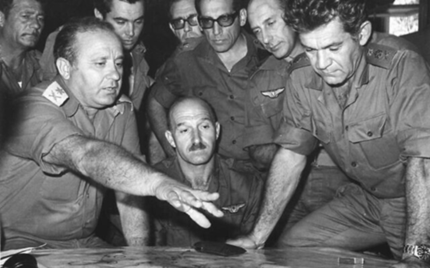 | Tư lệnh Quân khu phía Bắc Yizhak Hofi (trái) thảo luận với Tổng tham mưu trưởng Quân đội Israel David El’azar (phải) và các sĩ quan cấp cao khác trong Cuộc chiến Yom Kippur năm 1973. Ảnh: Cơ quan Lưu trữ Bộ Quốc phòng Israel |