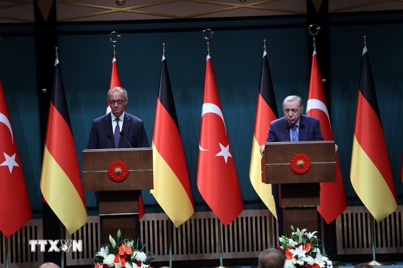 Thủ tướng Đức Friedrich Merz (trái) và Tổng thống Thổ Nhĩ Kỳ Recep Tayyip Erdogan tại cuộc họp báo ở Ankara. Ảnh: TTXVN