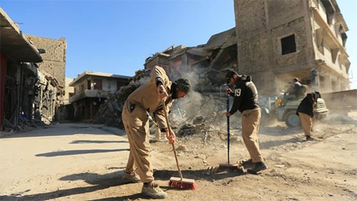 Các nhân viên dọn dẹp đường phố ở Mosul tháng 3-2018 sau khi IS rút khỏi thành phố này. Ảnh: foreignaffairs.com |