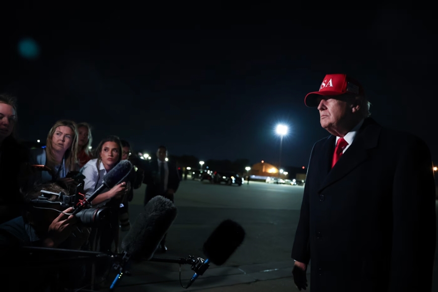 | Tổng thống Mỹ Donald Trump trả lời truyền thông sau khi đưa ra lệnh phong tỏa eo biển Hormuz. Ảnh: Getty |
