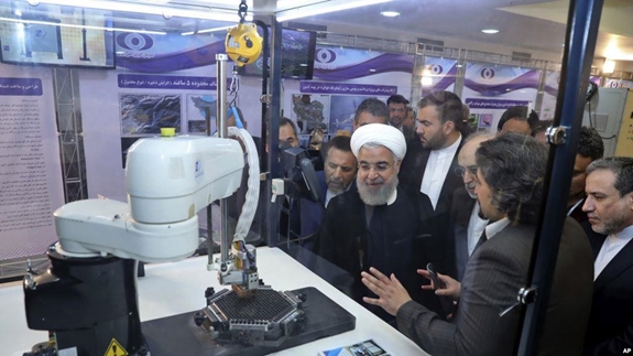 Tổng thống Iran Hassan Rouhani nghe giới thiệu về các thành tựu hạt nhân của nước này. Ảnh: Reuters. |