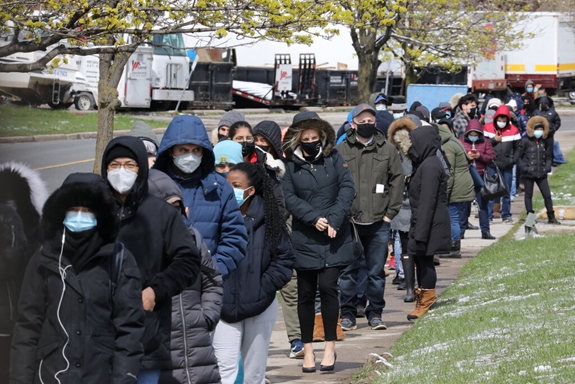 | Người dân ở thủ đô Toronto (Canada) xếp hàng chờ tiêm vaccine ngừa Covid-19, tháng 4-2021. Ảnh: Reuters. |