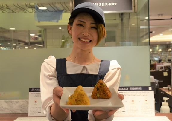 | Hai loại cơm omusubi được nhóm “Thưởng thức và tiếp sức phương Đông” giới thiệu tại Tokyo vừa qua. Ảnh: Kyodo |