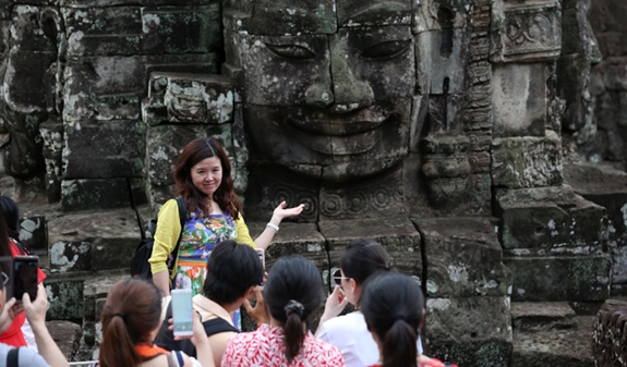 Hướng dẫn viên du lịch tại địa điểm du lịch nổi tiếng Angkor Wat, Campuchia. Ảnh: Khmer Times |