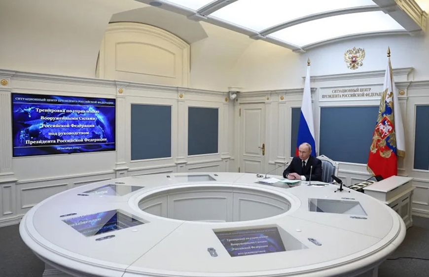 | Tổng thống Vladimir Putin kiểm tra cuộc tập trận quân sự của lực lượng hạt nhân Nga thông qua liên kết video từ Moscow, ngày 22-10-2025. Ảnh: Sputnik |