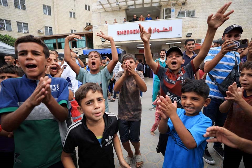 Trẻ em ở dải Gaza ăn mừng sau khi Israel và Hamas nhất trí về giai đoạn đầu tiên của lệnh ngừng bắn. Ảnh: Reuters |
