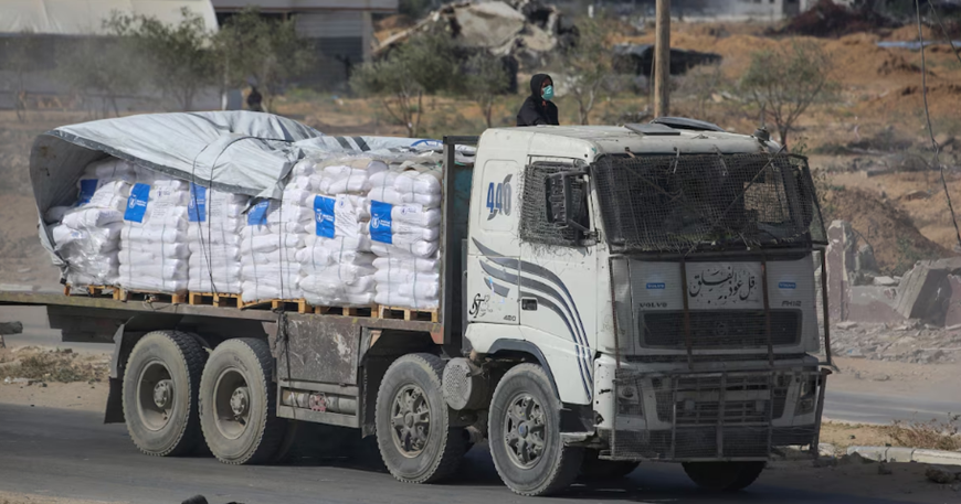 Một chiếc xe tải chở hàng viện trợ do Chương trình Lương thực Thế giới (WFP) cung cấp chạy trên đường ở Deir el-Balah, miền trung Dải Gaza, vào ngày 15-10. Ảnh: lexpress.fr |