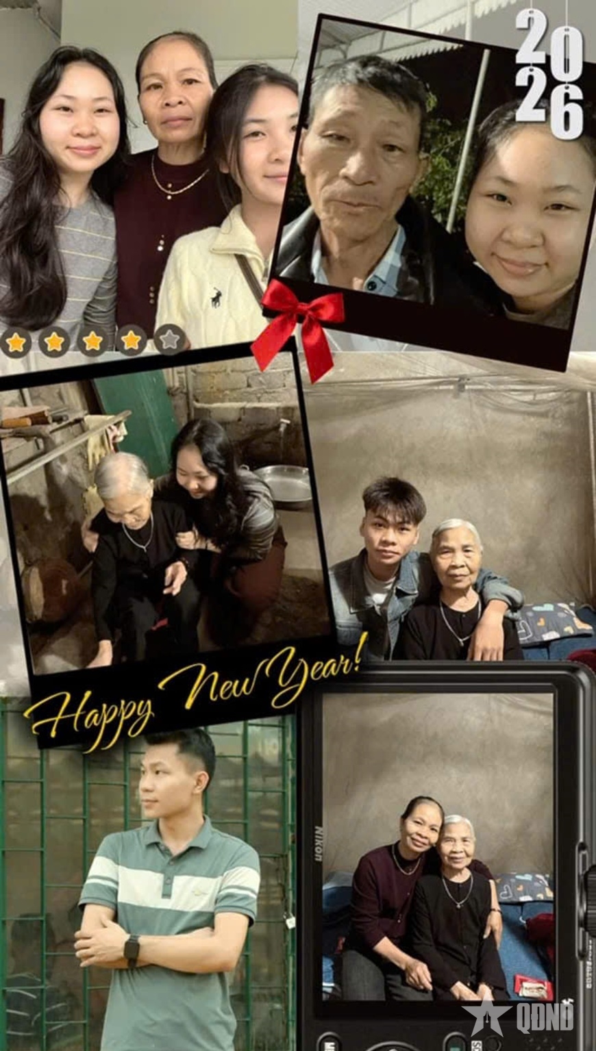 | Những bức ảnh gia đình gửi sang chúc mừng năm mới được Đức ghép lại đầy thân thương. Trong ảnh là bà ngoại 85 tuổi cùng bố mẹ, các em và Đức (góc dưới cùng bên trái). |