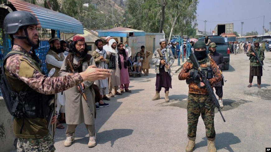| Lính Pakistan và chiến binh Taliban canh gác tại một điểm giao cắt biên giới giữa Pakistan và Afghanistan, ngày 5-9-2021. Ảnh: AP |