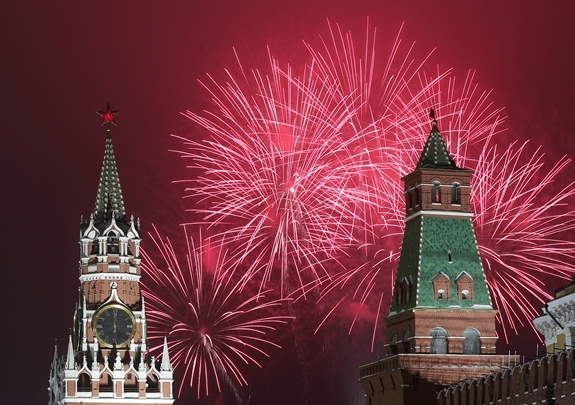 | Quảng trường Đỏ ở Thủ đô Moscow, Nga được chiếu sáng bởi các màn pháo hoa chào đón năm mới. |