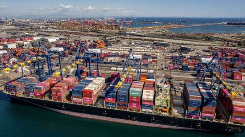 Tàu container cập cảng Los Angeles, bang California, Mỹ ngày 4-4. Ảnh: RTE