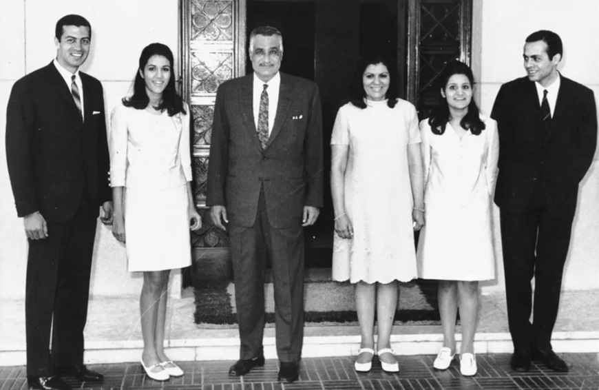 | Tổng thống Gamal Abdel Nasser cùng vợ, hai con gái và hai con rể. Ashraf Marwan đứng cạnh Moona phía ngoài cùng bên phải. Ảnh: noemamag.com |
