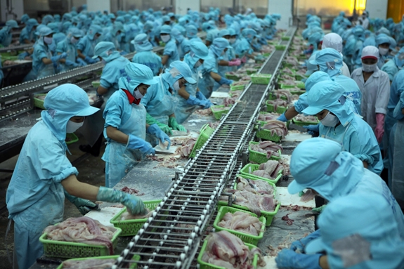 Công nhân Công ty cổ phần thủy sản Hà Nội-Cần Thơ trong ca sản xuất. Ảnh: Vũ Phong
