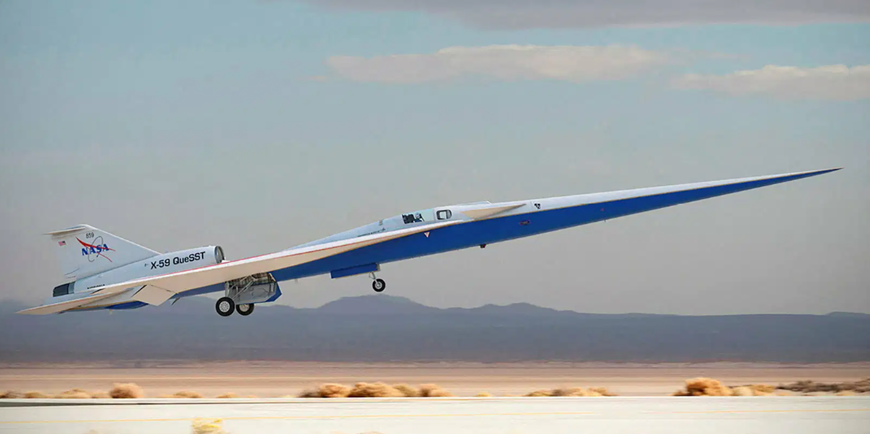 Trong chuyến bay thử nghiệm đầu tiên, máy bay siêu thanh X-59, dưới sự điều khiển của phi công Nils Larson, đã cất cánh từ đường băng tại Nhà máy 42 ở Palmdale, cách Los Angeles khoảng 100km về phía bắc. Sau khi vượt qua các cánh đồng phía Đông đường băng, máy bay quay về phía bắc hướng đến Căn cứ Không quân Edwards, nơi nó hạ cánh an toàn một giờ sau đó gần Trung tâm Nghiên cứu chuyến bay Armstrong của NASA. X-59 được hộ tống bởi một máy bay quan sát của NASA. Hình dáng đặc trưng của máy bay được thiết kế để làm giảm đáng kể tiếng nổ siêu thanh thường phát ra khi vượt qua rào cản âm thanh, giảm nó xuống chỉ còn một tiếng "thịch" nhỏ, tương đương với tiếng đóng sầm cửa xe ô tô.