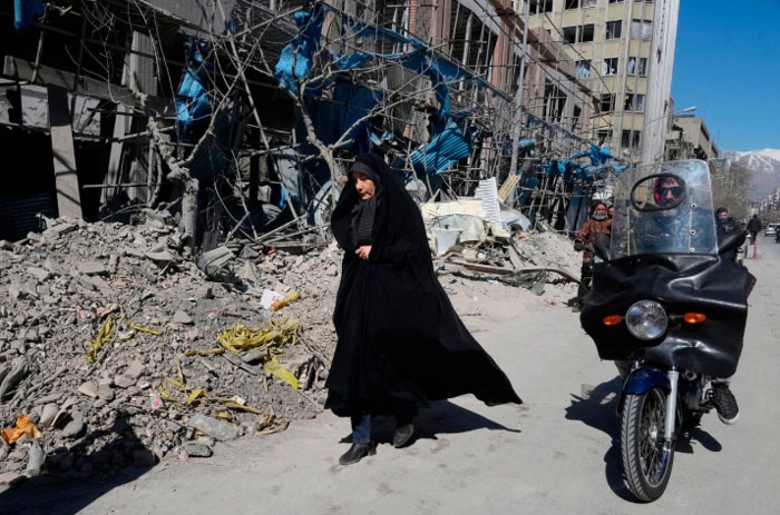 | Người dân đi ngang qua một tòa nhà bị hư hại ở thủ đô Tehran sau cuộc tấn công của Mỹ và Israel ngày 4-3. Ảnh Irish Independent |