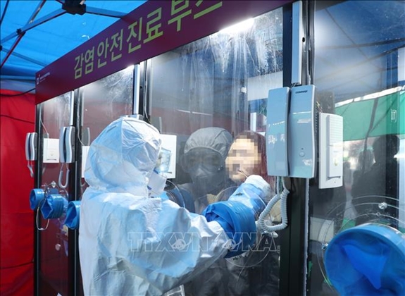 Nhân viên y tế lấy mẫu bệnh phẩm từ bệnh nhân để xét nghiệm COVID-19 tại một bệnh viện ở Seoul, Hàn Quốc ngày 16/3/2020. Ảnh minh họa: Yonhap/TTXVN. |