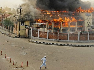 | Trường học bị người biểu tình phóng hỏa tại Srinagar ngày 11-9. (Ảnh: AFP). |