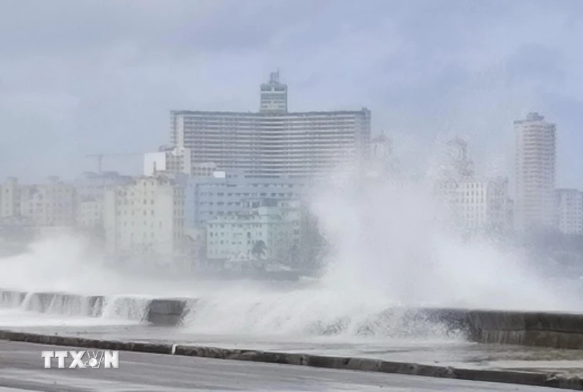 Sóng lớn tràn qua đê biển Malecon ở Thủ đô La Habana, Cuba. Ảnh: TTXVN