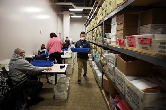 Nhân viên kiểm phiếu tại Ủy ban Bầu cử Hạt Franklin, Columbus, Ohio, đêm 3-11. Ảnh: Reuters. |