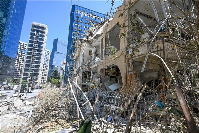 | Tòa nhà bị phá hủy sau cuộc tấn công tên lửa tại Ramat Gan, Israel. |