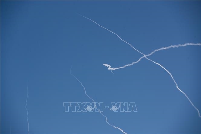 Những vệt khói trên bầu trời Tel Aviv (Israel) khi hệ thống phòng không Israel đánh chặn tên lửa từ Iran ngày 1-3-2026. Ảnh minh họa