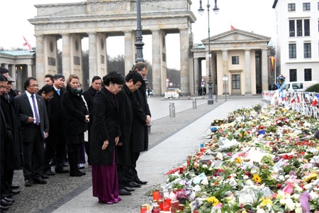 Chủ tịch nước Trương Tấn Sang và Phu nhân cùng Thị trưởng Béc-lin đặt hoa trước Đại sứ quán Pháp để tưởng niệm những nạn nhân vụ khủng bố tại Pa-ri.