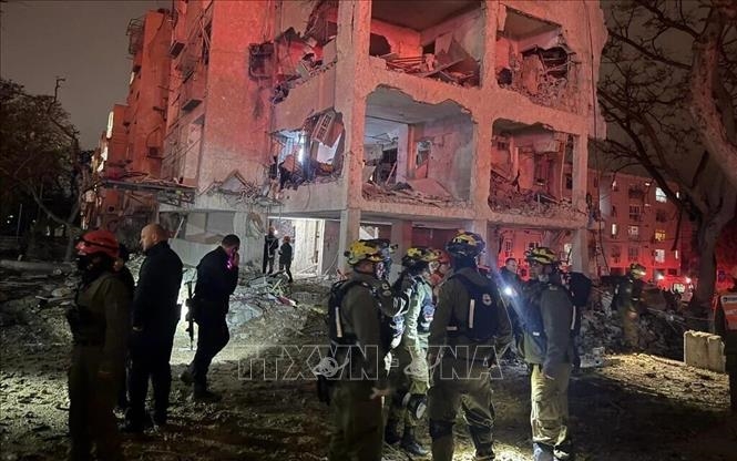 Các lực lượng ứng cứu khẩn cấp tại hiện trường vụ tấn công bằng tên lửa đạn đạo của Iran ở thành phố Arad, miền Nam Israel tối 21-3-2026.