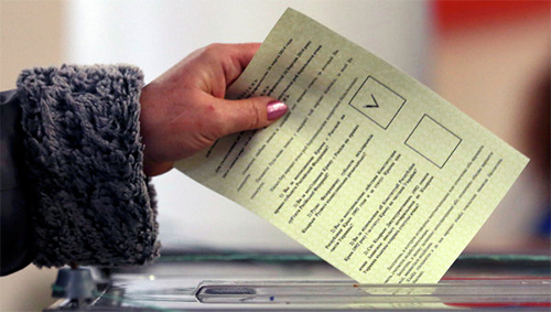 Một lá phiếu ủng hộ Crưm sáp nhập với Liên bang Nga được bỏ vào thùng phiếu