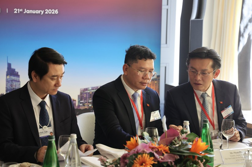 Thứ trưởng Bộ Ngoại giao Lê Anh Tuấn (giữa) cùng đoàn Việt Nam tham dự sự kiện tại WEF Davos 2026.