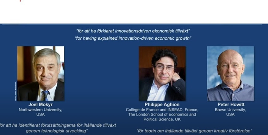 Vào lúc 16 giờ 45 phút ngày 13-10 theo giờ Hà Nội, Viện Hàn lâm Khoa học Hoàng gia Thụy Điển tại Stockholm đã công bố giải Nobel Kinh tế năm 2025 thuộc về nhà khoa học Joel Mokyr (Đại học Northwestern, Evanston, IL, Mỹ), Philippe Aghion (Trường Kinh tế và Khoa học Chính trị London, Vương quốc Anh) và Peter Howitt (Đại học Brown, Providence, RI, Mỹ) vì đã giải thích được sự tăng trưởng kinh tế nhờ đổi mới sáng tạo.