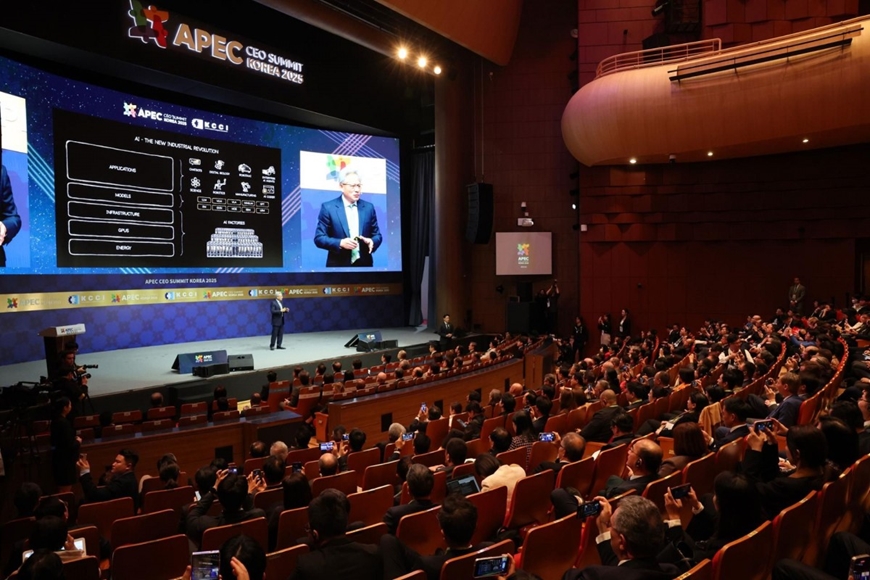 | CEO Nvidia Jensen Huang phát biểu tại phiên thảo luận ngày 31-10 của Hội nghị thượng đỉnh doanh nghiệp APEC 2025 tại thành phố Gyeongju, Hàn Quốc. Ảnh: Korea Times |