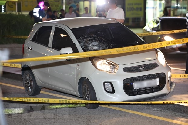 Cảnh sát phong tỏa hiện trường vụ đâm xe và đâm dao gần ga tàu điện ngầm Seohyeon, phía Nam thủ đô Seoul, Hàn Quốc tối 4-8-2023. Ảnh: Yonhap/TTXVN