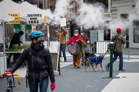 Người dân đeo khẩu trang phòng dịch Covid-19 khi mua sắm tại một chợ nông sản ở New York, Mỹ ngày 27-4-2020. |