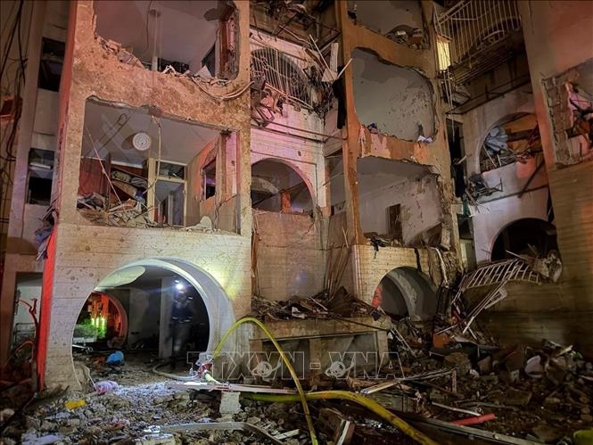 Một tòa nhà trúng tên lửa của Iran tại thị trấn Arad, Israel tối 21-3-2026.