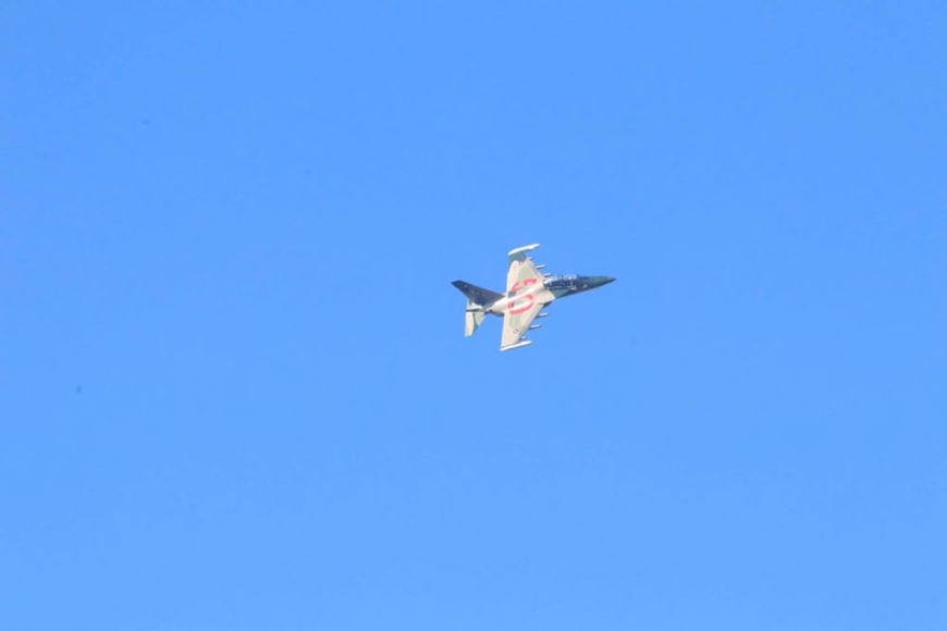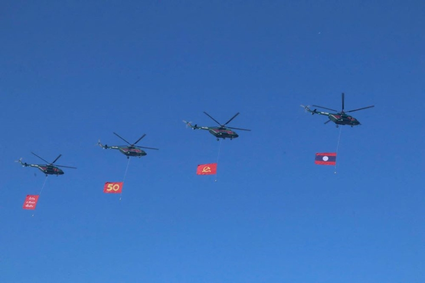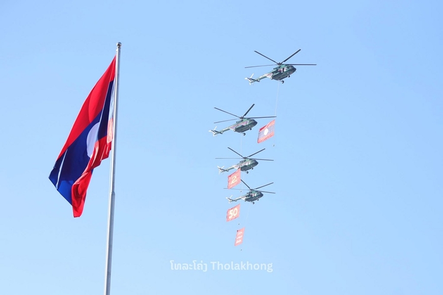 | Đội hình máy bay trực thăng mang theo Quốc kỳ Lào, cờ Đảng Nhân dân Cách mạng Lào, lá cờ in số “50” và cờ khẩu hiệu “Tinh thần 2-12 muôn năm” tung bay trên nền trời xanh. Ảnh: tholakhong.com |