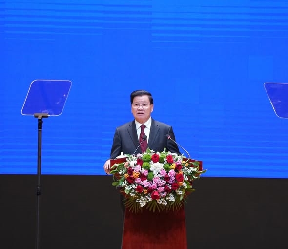 | Tổng Bí thư, Chủ tịch nước Lào Thongloun Sisoulith phát biểu tại lễ kỷ niệm. |
