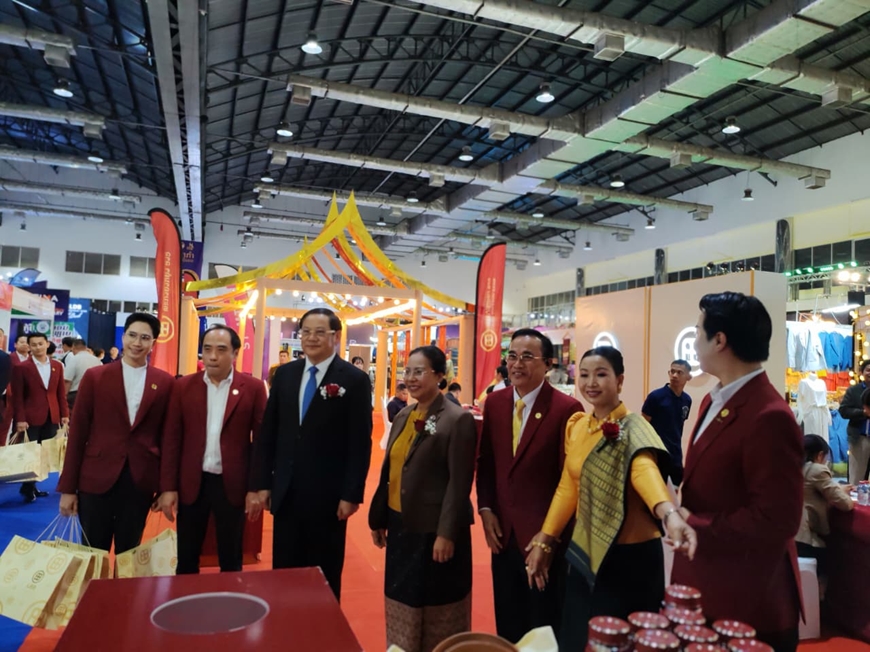 | Thủ tướng Chính phủ Lào Sonexay Siphandone cùng các đại biểu tại triển lãm. |