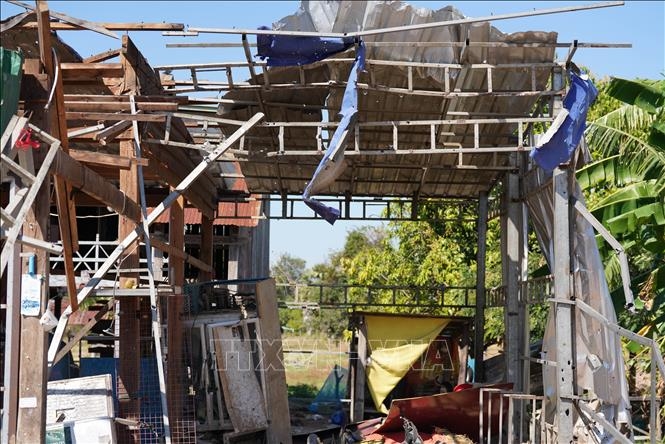 | Nhà dân ở tỉnh Oddar Meanchey (Campuchia) bị phá hủy trong xung đột biên giới giữa Thái Lan và Campuchia, ngày 20-12-2025. Ảnh: THX/TTXVN |