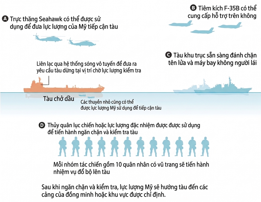 Bất kỳ tàu chiến nào của Mỹ cũng có thể tiếp cận các tàu chở dầu bị nghi ngờ vi phạm lệnh phong tỏa. Trong trường hợp tàu không tuân thủ yêu cầu kiểm tra, lực lượng chuyên biệt như Thủy quân lục chiến và các đơn vị tác chiến đặc biệt, bao gồm SEAL, sẽ tiến hành đột kích và kiểm soát tàu.