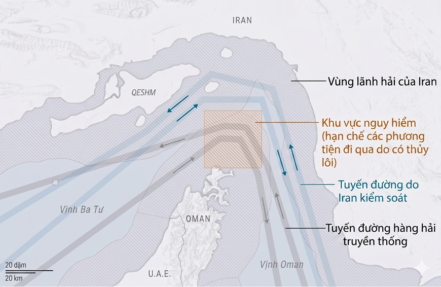| Vị trí khu vực được cho là có nhiều thủy lôi do phía Iran thả xuống tại eo biển Hormuz. Đồ họa: WSJ / Việt hóa: TRUNG THÀNH |