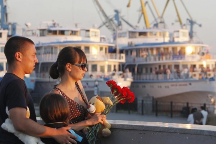 Một gia đình mang hoa và gấu bông tới cảng Kazan để tưởng niệm các nạn nhân trong vụ chìm tàu năm 2011. Ảnh minh họa. |