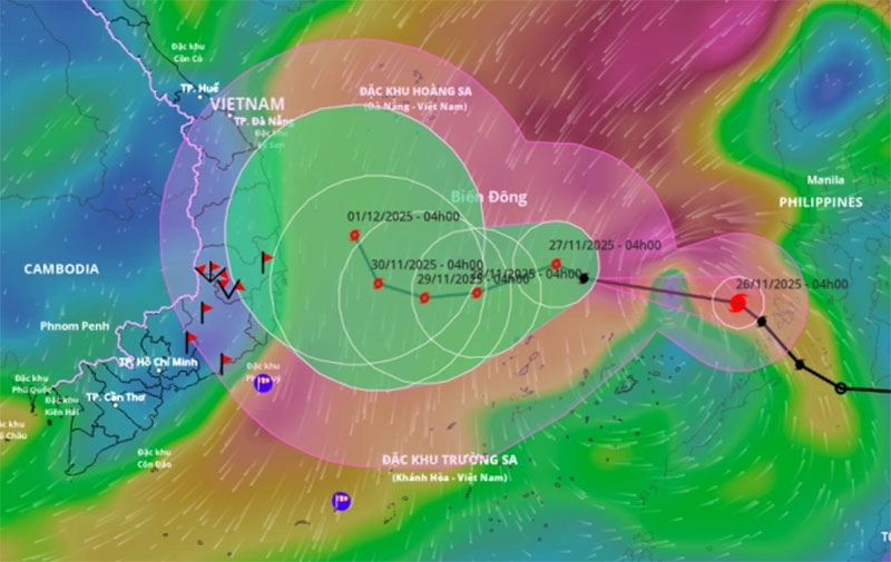 Theo Trung tâm Dự báo Khí tượng Thủy văn quốc gia, vào 4 giờ ngày 26-11, tâm bão cách đảo Song Tử Tây khoảng 540 km về phía đông, sức gió mạnh nhất 74 km/giờ, cấp 8, giật cấp 10 và đang theo hướng Tây Bắc với tốc độ 20-25 km/giờ. Sức gió mạnh nhất vùng gần tâm bão mạnh cấp 8 (62-74km/giờ), giật cấp 10. Di chuyển theo hướng Tây Bắc với tốc độ khoảng 25km/giờ.