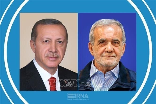 Tổng thống Thổ Nhĩ Kỳ Recep Tayyip Erdogan (bên trái) và Tổng thống Iran Masoud Pezeshkian.
