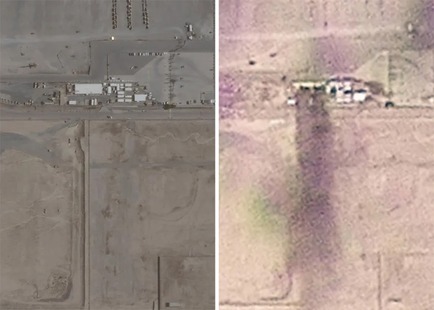 | Hai bức ảnh này cho thấy địa điểm các binh sĩ Mỹ thiệt mạng tại Kuwait. Ảnh bên trái chụp ngày 26-6-2025. Ảnh bên phải chụp ngày 1-3-2026. Ảnh: Planet Labs PBC |