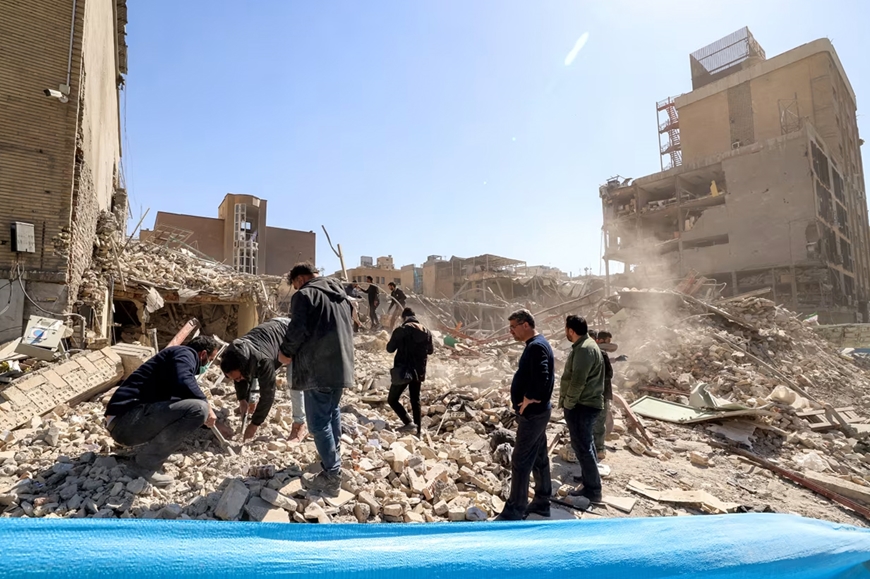 | Người dân kiểm tra đống đổ nát của một tòa nhà bị sập gần Quảng trường Ferdowsi ở Tehran, Iran. Ảnh: Getty Images |