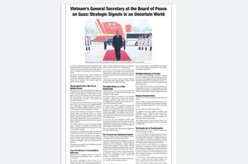Bài viết cho rằng, trong bối cảnh thế giới ngày càng bị chi phối bởi xung đột, phân mảnh và cạnh tranh địa chính trị, việc Tổng Bí thư Tô Lâm tham dự Phiên họp khai mạc Hội đồng Hòa bình về Gaza tại Washington mang ý nghĩa vượt xa khuôn khổ ngoại giao thông thường.